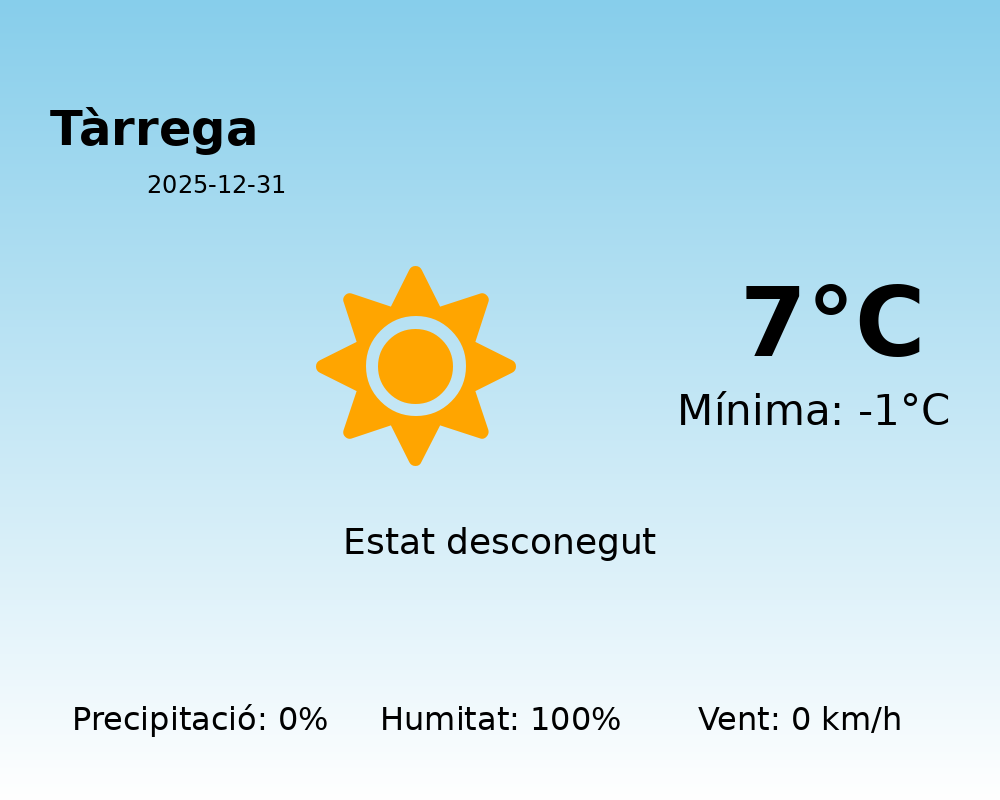 Avui a Tàrrega, esperem un dia fresc, amb una temperatura màxima que arribarà als 7°C i una temperatura mínima de -1°C. Tot i que les temperatures seran bastant baixes, no es preveuen precipitacions, així que podrem gaudir d’un dia sec.