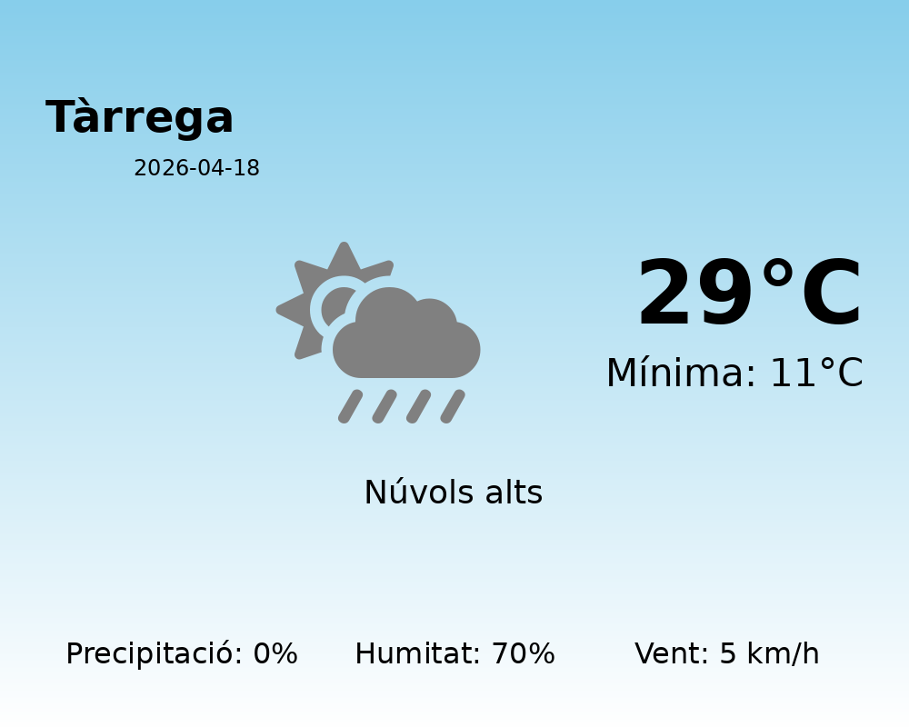 En resum, Tàrrega gaudirà d’un dia majoritàriament assolellat i càlid, ideal per passejos i activitats a l’aire lliure. Recordeu hidratar-vos bé durant les hores de més calor i gaudiu del bon temps!
