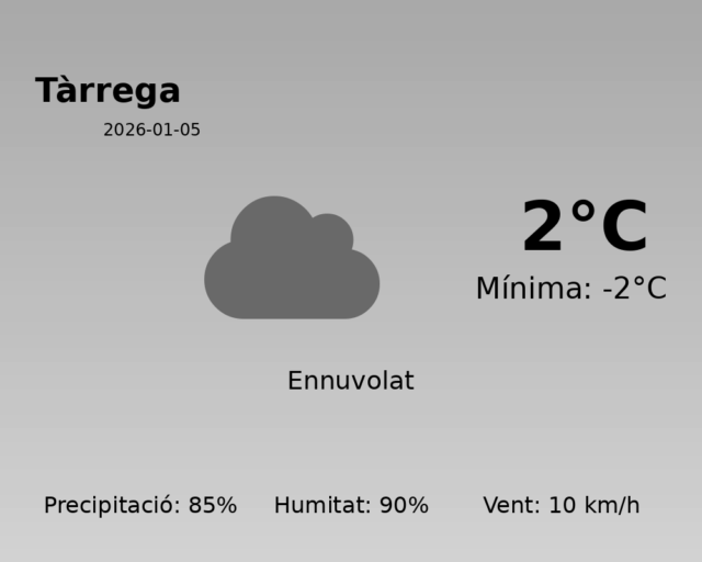 Avui a Tàrrega s’espera un dia fred i humit, amb un predomini de núvols que cobriran pràcticament tota la jornada. La temperatura mínima serà de -2°C i la màxima arribarà a només 2°C, la qual cosa mantindrà l’ambient gèlid durant tot el dia.