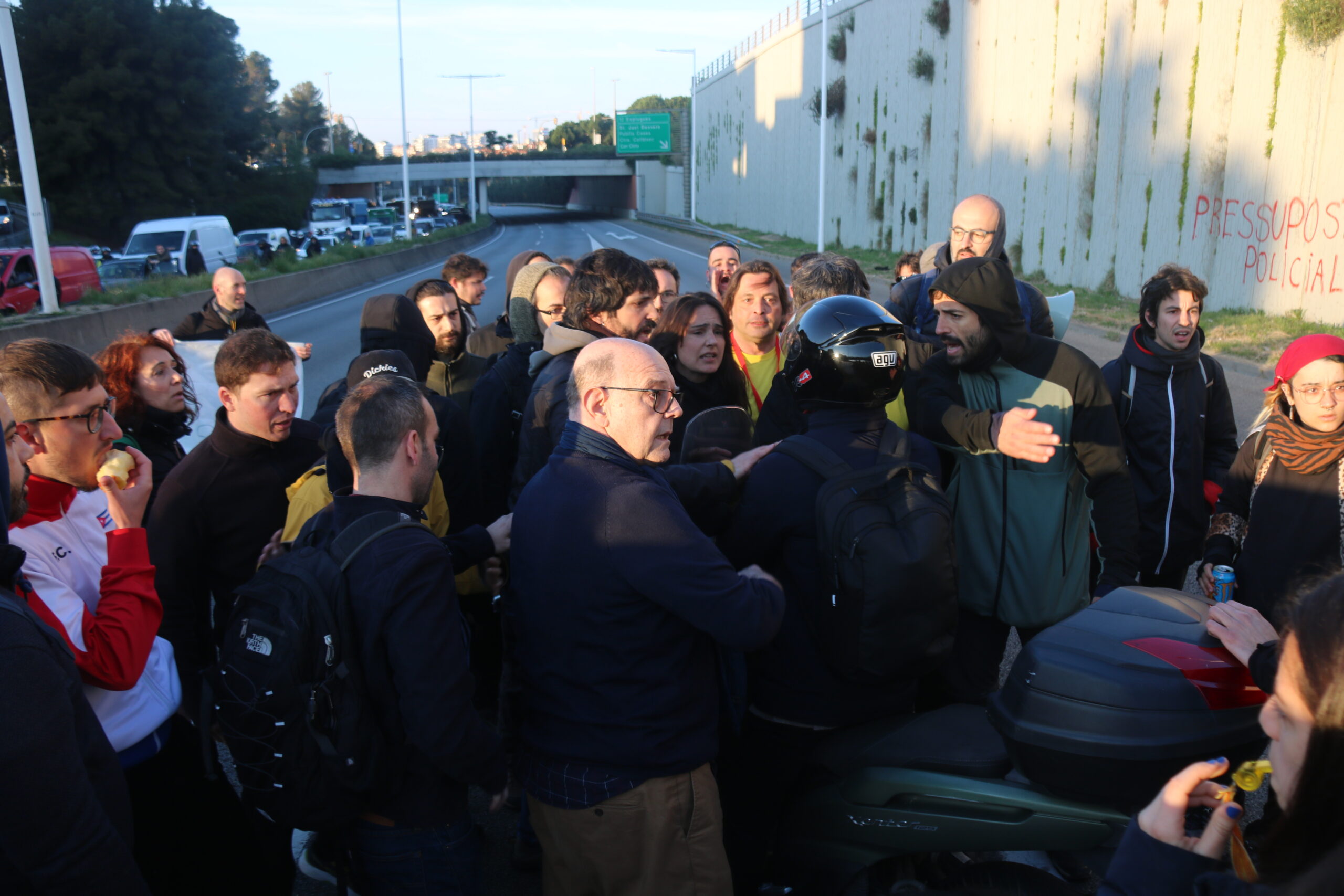 En el tercer punt on s’ha tallat la B-20, just en la connexió amb la C-32, a Esplugues de Llobregat, s’han viscut moments de tensió amb alguns conductors. En concret, alguns motoristes han començat a pressionar contra el cordó que feia el tall en direcció al Baix Llobregat per aconseguir passar, i hi ha hagut empentes i insults. Fins i tot, algun manifestant ha agafat les claus de la moto d’algun conductor per impedir-hi el pas. Finalment, i davant l’escalada de la tensió, els manifestants han decidit deixar passar els motoristes però amb el motor apagat.