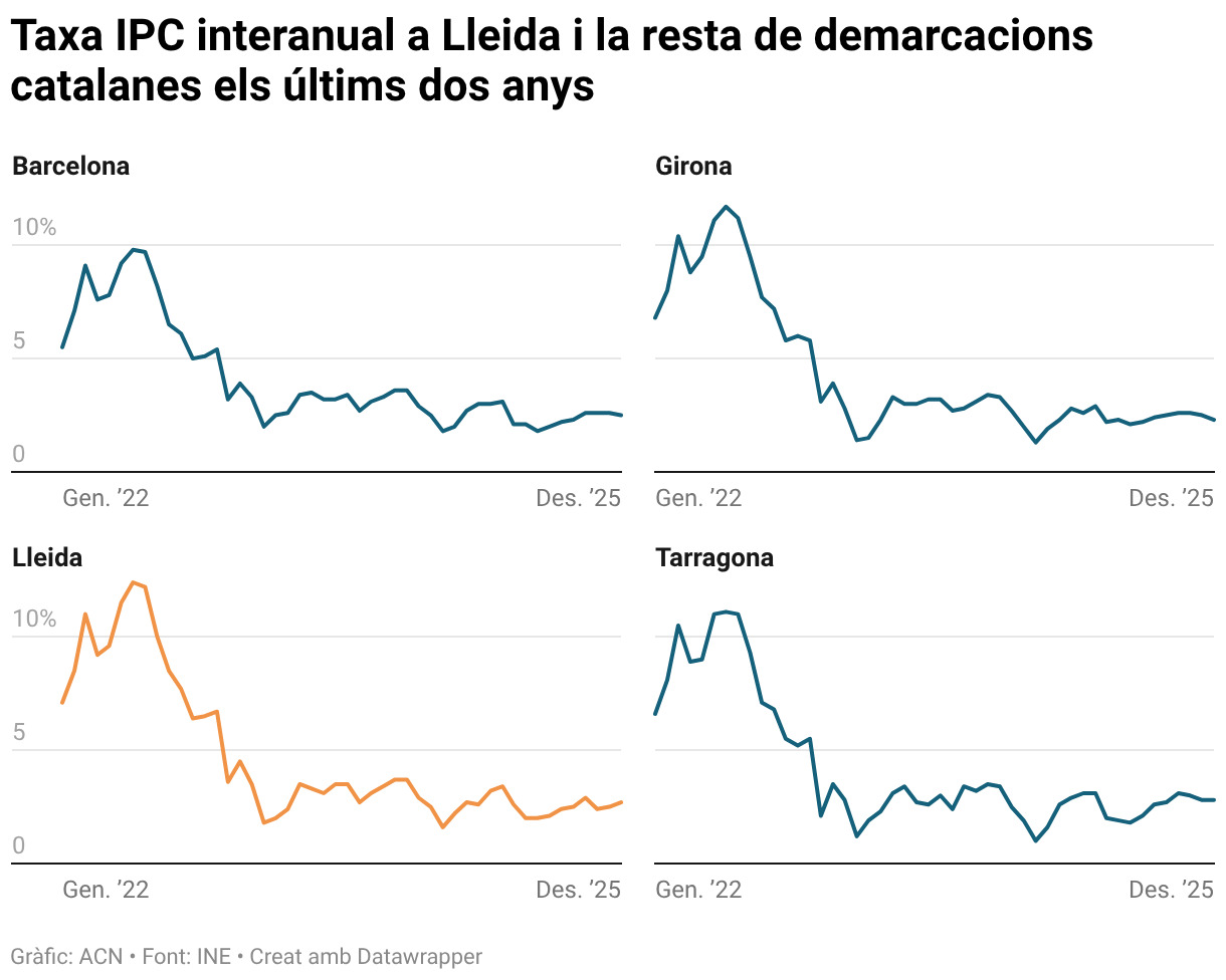 ACN Madrid – L’Índex de Preus del Consum (IPC) va pujar dues dècimes al desembre fins al 2,7% a les comarques de Ponent i l’Alt Pirineu i Aran, segons dades publicades aquest dijous per l’Institut Nacional d’Estadística (INE). Es tracta d’una variació d’una dècima més per sobre del que van experimentar els preus a la demarcació de Lleida el desembre de 2024. Els preus que més pugen són els dels aliments i les begudes, fins al 3,4% (6 dècimes), mentre que els de les begudes alcohòliques i el tabac baixen fins al 3,7%. Al conjunt de Catalunya la inflació s’ha moderat una dècima al desembre i va tancar el 2025 amb una variació del 2,5%. Els aliments acaben l’exercici amb una alça de preus del 2,7%, encapçalat pels ous, que continuen un 20% més cars.