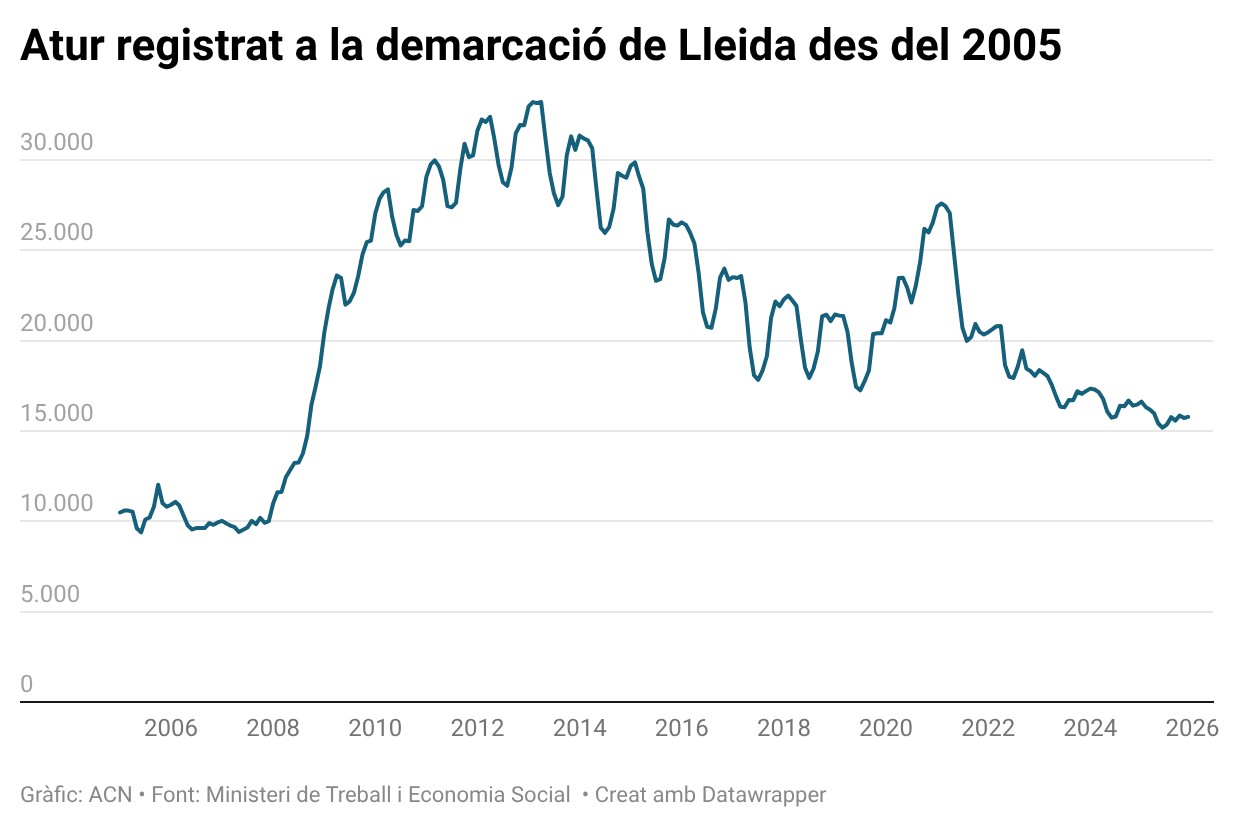 ACN Lleida – L’atur ha pujat un 0,4% al mes de desembre a les comarques de Ponent i l’Alt Pirineu i Aran i el nombre de desocupats se situa en 15.789 persones, 63 més de les que hi havia al mes de novembre. Si es compara amb el mateix mes de l’any passat hi ha un descens del 4,13% amb 680 desocupats menys, segons les dades que el Ministeri de Treball ha donat a conèixer aquest dilluns. Pel que fa a l’afiliació a la Seguretat Social, a la demarcació hi ha 211.966 persones ocupades, 1.262 més respecte al mes de novembre (0,60%). Si la xifra es compara amb el mateix mes de fa un any, a les comarques de Ponent i l’Alt Pirineu hi ha 5.473 afiliats més.
