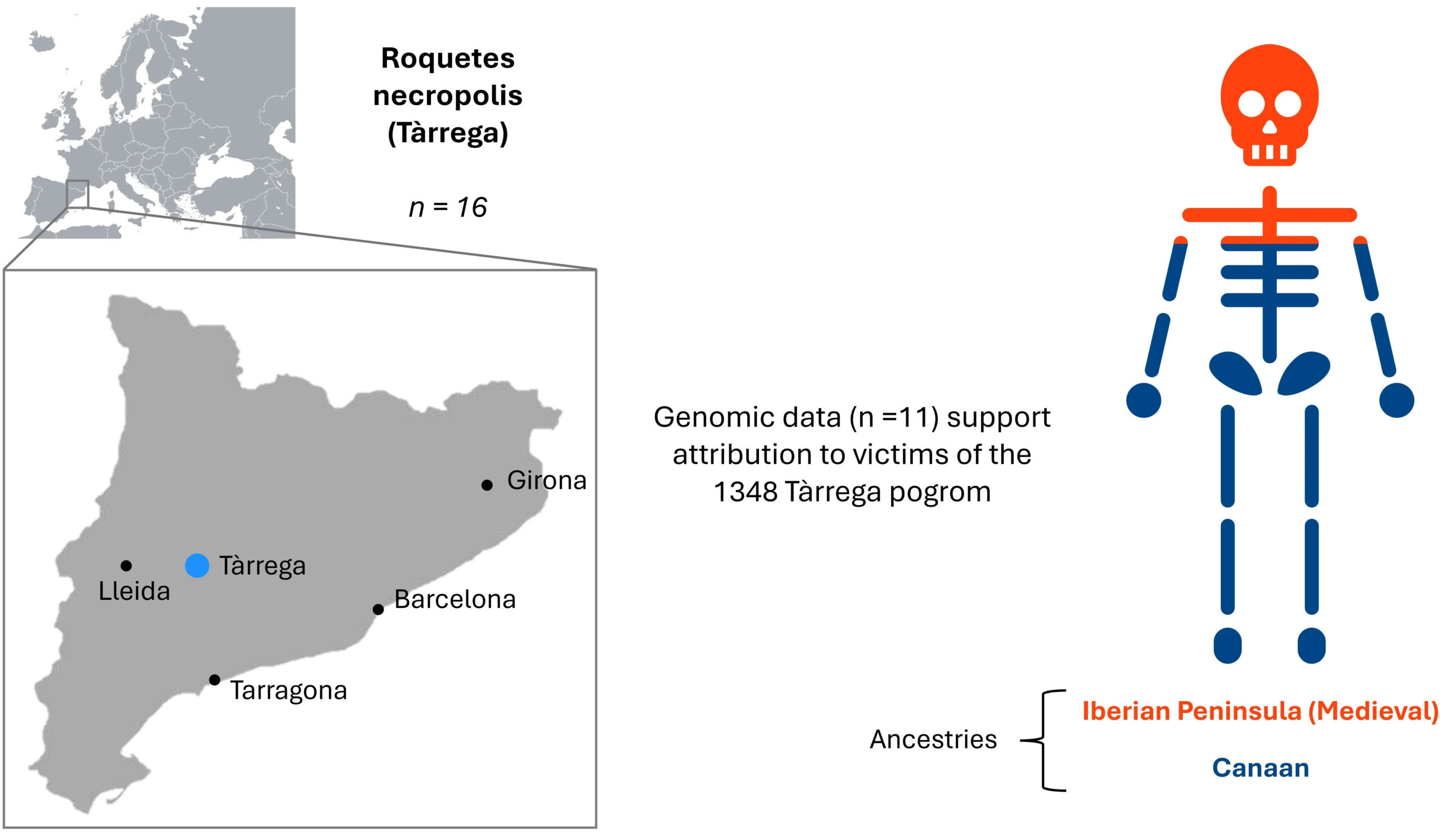 ACN Barcelona – El Departament de Cultura ha impulsat el primer estudi genètic d’una comunitat jueva medieval a Catalunya. S’han analitzat les restes òssies de 16 individus de la necròpolis jueva de les Roquetes, a Tàrrega. Es tracta d’un espai funerari relacionat amb el pogrom de 1348. Les fosses comunes mostraven evidències clares de mort violenta i un enterrament simultani massiu, d’acord amb fonts històriques que parlen de la mort d’uns 300 membres de la comunitat jueva targarina. L’estudi revela una notable diversitat d’ADN mitocondrial, amb múltiples línies maternes documentades històricament en poblacions jueves, així com tres clades paternes habituals en comunitats de la diàspora i arrels al Pròxim Orient.