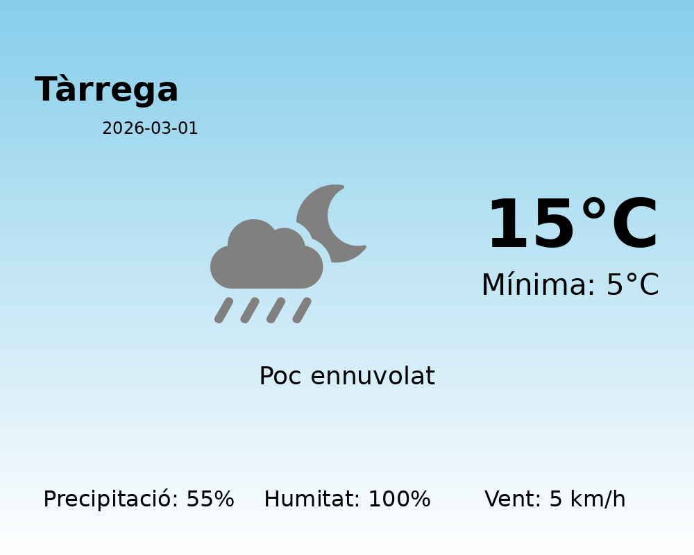 Avui, la ciutat de Tàrrega es prepara per a un dia amb condicions meteorològiques diverses. La temperatura màxima esperada és de 15 °C, mentre que la mínima serà de 5 °C. Això indica un lleuger contrast tèrmic típic d’un dia de principis de primavera.