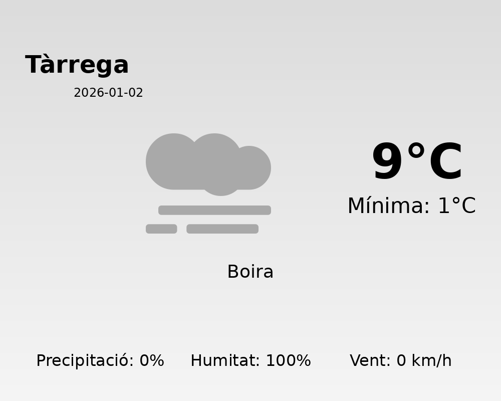 Benvinguts al nostre informe meteorològic diari. Avui, a Tàrrega, es preveu un dia hivernal amb condicions força característiques del mes de gener. La temperatura presentarà un oscil·lació notable, amb una màxima prevista de 9 graus Celsius i una mínima de 1 grau Celsius. Això indica un clima fred al llarg del dia, especialment durant les hores nocturnes i matinades.