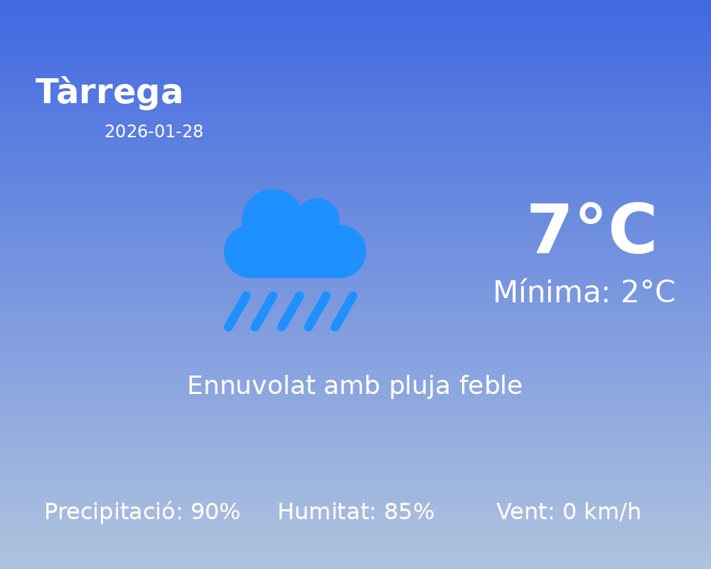 Avui, els habitants de Tàrrega es preparen per a un dia d’hivern humit i fred. Les temperatures es mouran entre un mínim de 2°C i un màxim de 7°C. Si bé les temperatures poden semblar relativament suaus, la jornada estarà marcada per altres factors meteorològics significatius.