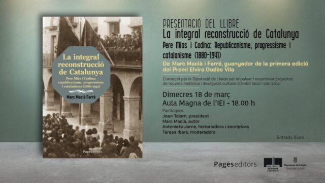 El dimecres 18 de març, l’Aula Magna de l’Institut d’Estudis Ilerdencs acollirà l’acte de presentació de l’obra ‘La integral reconstrucció de Catalunya. Pere Mias i Codina: republicanisme, progressisme i catalanisme (1880-1941)’ escrita per l’historiador Marc Macià. Aquest llibre, guanyador del 1er Premi de Recerca Elvira Godàs, explora la vida i llegat de Mias Codina, un notable polític i advocat català que va jugar un paper fonamental en la història del republicanisme a Catalunya.