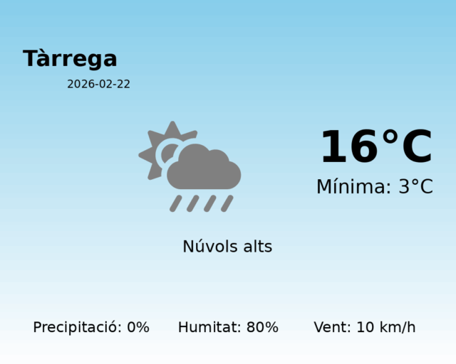 Avui, 22 de febrer de 2026, Tàrrega gaudirà d’un dia tranquil i estable, amb temperatures suaus i sense presència de precipitacions.