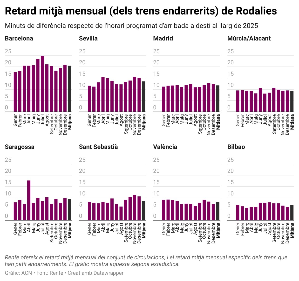 ACN Barcelona – Rodalies de Barcelona va registrar un compliment horari de només el 50% el 2025, segons els informes mensuals de puntualitat publicats per Renfe al llarg de l’any. La xarxa de trens de curta distància catalans se situen així a la cua dels 13 nuclis de l’Estat de què la companyia ha difós dades, per darrere de Sevilla (58%) i molt lluny de Madrid (68%) o Bilbao (87%). De fet, Rodalies ha estat la que menys ha complert amb l’horari en nou dels dotze mesos de l’any passat. A més, el retard mitjà d’aquells trens que arriben a destí amb endarreriment respecte a l’horari previst per Renfe és de 20 minuts a la xarxa catalana, una xifra notablement més alta que a la resta. El de Sevilla és el segon, amb 13 minuts de demora mitjana.