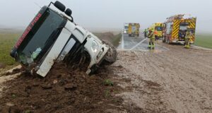 Un camió surt de la via i bolca a Bellcaire d’Urgell