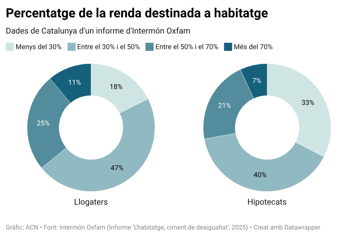 D’altra banda, un 11,1% dels inquilins catalans destinen més d’un 70% del sou a l’allotjament, i un 24,8% més fan servir entre el 50 i el 70% del que cobren per sufragar la despesa en habitatge. En conjunt, vuit de cada deu llogaters hi destinen més d’un 30% dels ingressos que perceben. Entre els hipotecats, les xifres també són significatives: prop de set de cada deu hi destina més del 30% dels seus ingressos, mentre que un de cada quatre gasta més de la meitat del que cobra en la hipoteca.