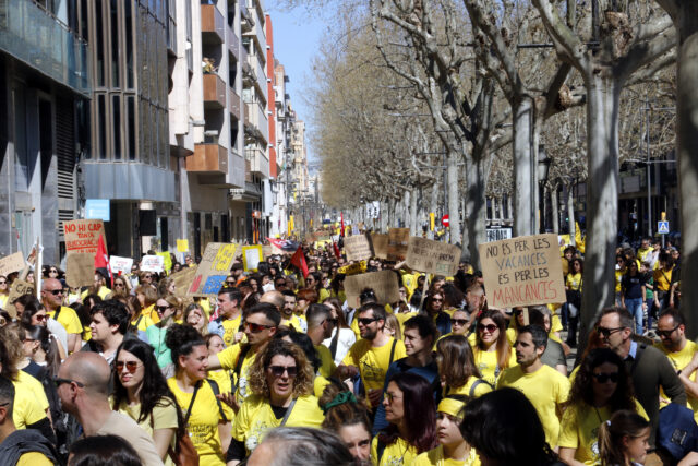 ACN Lleida – Milers de persones s’han manifestat aquest dimecres al migdia a la ciutat de Lleida en el tercer dia de vaga a l’educació. Unes 6.000 persones, segons la USTEC, i unes 3.000, segons la policia, han desfilat durant una hora i mitja entre la plaça Ricard Viñes i la plaça Sant Joan. Mestres, professors, personal laboral, famílies i alumnes han exigit més recursos i menys ràtios a les aules i millores salarials. A més, han mostrat pancartes i han cridat consignes contra l’acord assolit entre Educació i els sindicats UGT i CCOO. “És una errada històrica que no dona resposta a la reivindicació principal, que és la recuperació del nostre poder adquisitiu”, ha lamentat la portaveu d’USTEC a les comarques de Ponent, Rosa Aguilar.